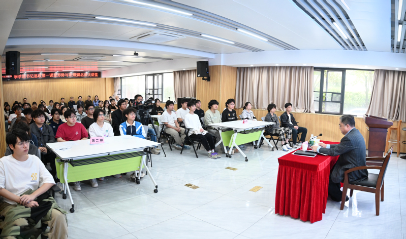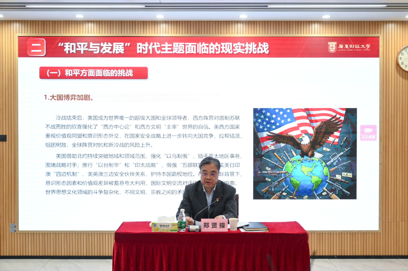在主题讲授环节,从电影《南京照相馆》的照片到今年9月3日我国隆重举行纪念中国人民抗日战争暨世界反法西斯战争胜利80周年大会,郑贤操通过当下鲜活的案例切入,引导同学们一起探讨和平与发展这一时代主题。