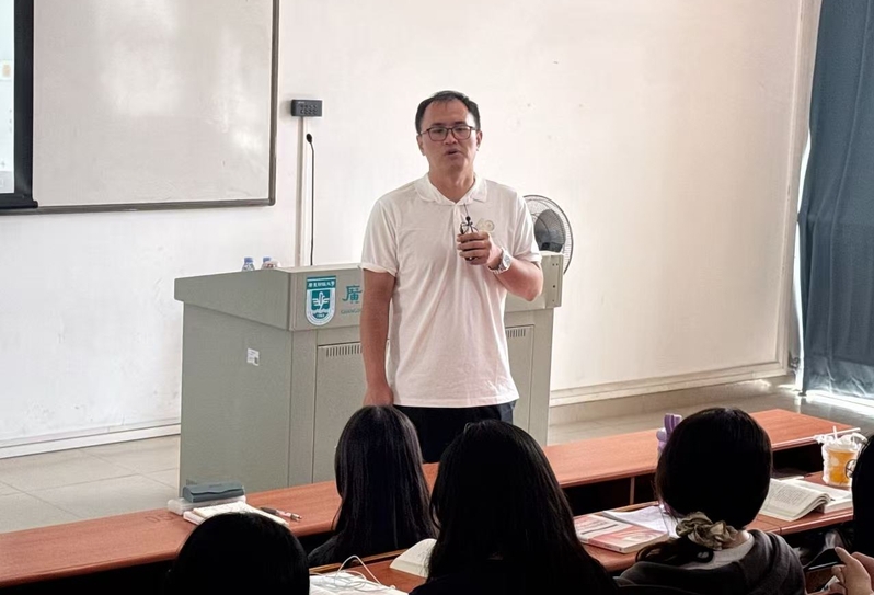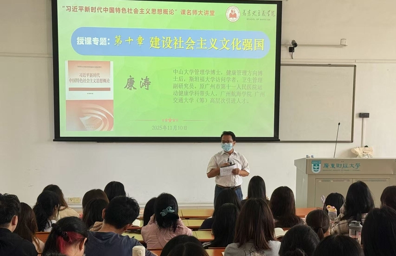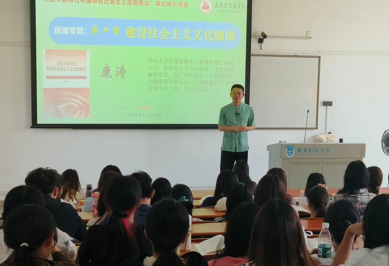 11月10日上午,“习近平新时代中国特色社会主义思想概论”名师大讲堂暨教研室集体备课会在乐学楼301室开展。广州航海学院康涛教授进行专题讲授。为2024级工商管理(创业管理方向)1班全体学生带来以“建设社会主义文化强国”为主要内容的专题讲座。马克思主义学院院长孙晓晖、党委书记张小洁和任课老师仇小敏、古华琼、乔良等列席课堂,习近平新时代中国特色社会主义思想概论教研室主任刘荣材主持课堂。