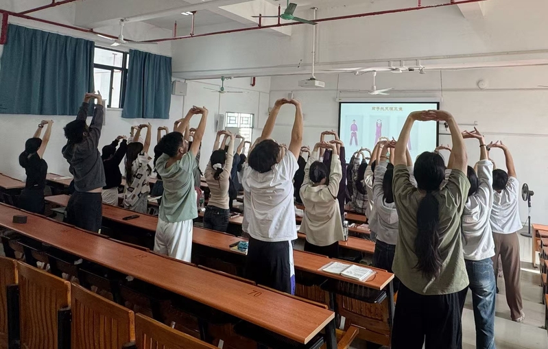 在武术教学环节,康教授亲自示范,带领同学们学习国家体育总局推荐的健身气功——八段锦。他从起势到收势,对每一式的动作要领、呼吸配合及健身功效进行了细致讲解和分解教学。同学们兴致高昂,纷纷跟随老师一招一式地认真练习,将课堂气氛推向了高潮。