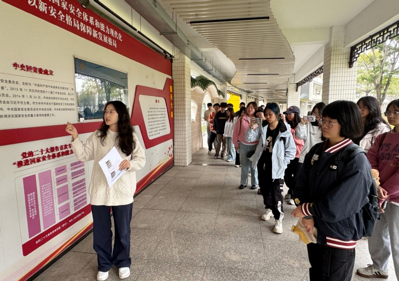 理论讲授结束后,全体同学在老师的带领下,集体前往我校“思政长廊”进行现场教学。在“国家安全教育”专题展区,由2位广东财经大学智慧党建服务团讲解员围绕总体国家安全观的体系框架与核心要义,结合展陈内容进行了深入的理论阐释与脉络梳理。讲解员从政治安全、经济安全、社会安全、网络安全等重点领域切入,系统解析了国家安全体系的构成要素与内在逻辑,进一步强化了同学们对课堂理论的理解与把握。乔良老师结合长廊展陈内容进行现场点拨,引导同学们将课堂所学理论与现实情境相联系,思考作为新时代大学生,应如何增强辨别和抵制危害国家安全的能力,自觉成为国家安全的坚定守护者。这种沉浸式、情境化的学习方式,激发了同学们的学习兴趣和参与热情,使抽象的理论知识变得可感可知、入脑入心。