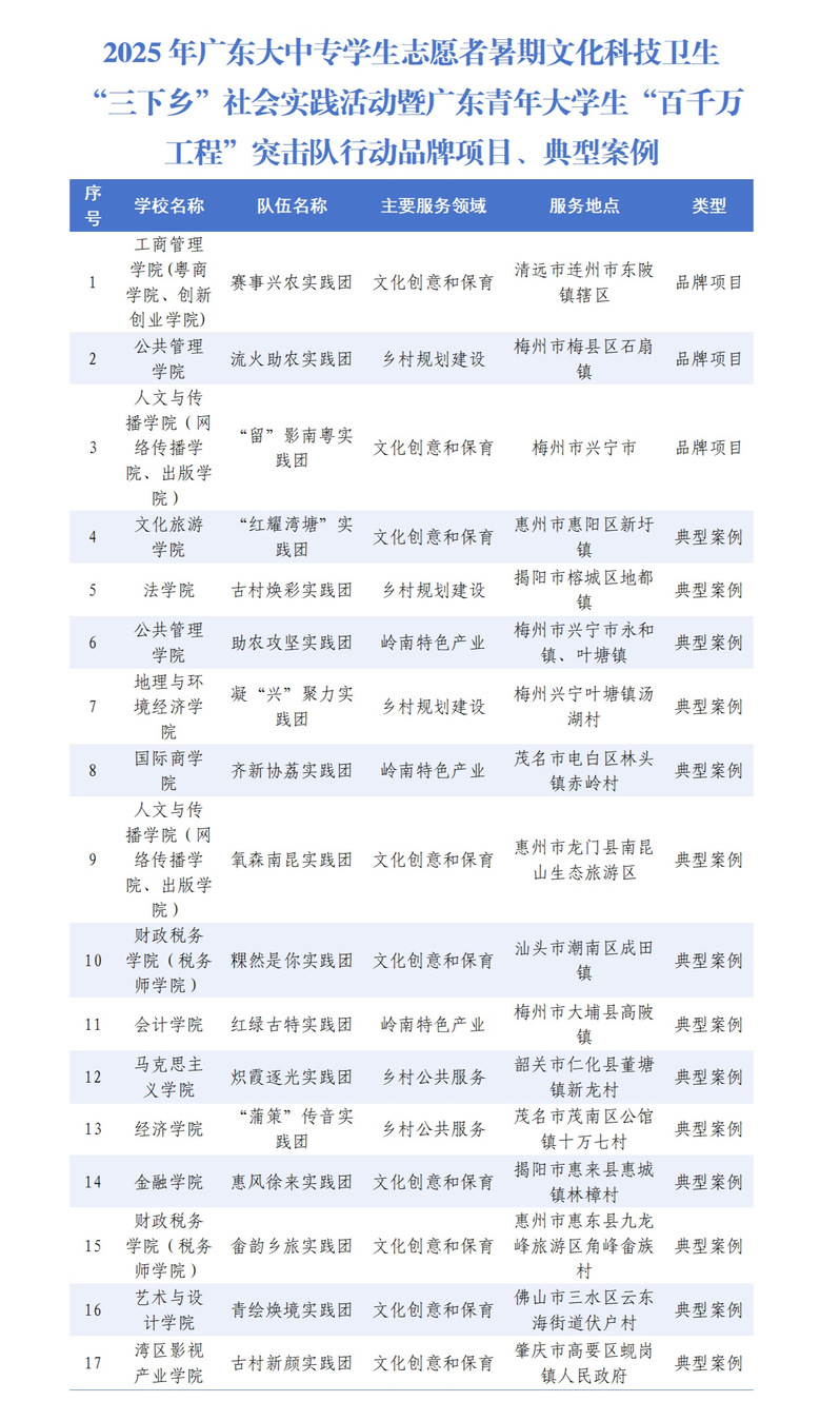 近日,共青团广东省委员会、中共广东省委宣传部、广东省精神文明建设办公室、广东省教育厅、广东省学生联合会发布《关于公布2025年广东大中专学生志愿者暑期文化科技卫生“三下乡”社会实践活动暨广东青年大学生“百千万工程”突击队行动品牌项目及典型案例的通知》,共评选出110个省级品牌项目与446个省级典型案例。我校3支队伍成功入选“百千万工程”突击队品牌项目,14支队伍成功入选“百千万工程”突击队典型案例。其中马克思主义学院学生团队入选典型案例1项。