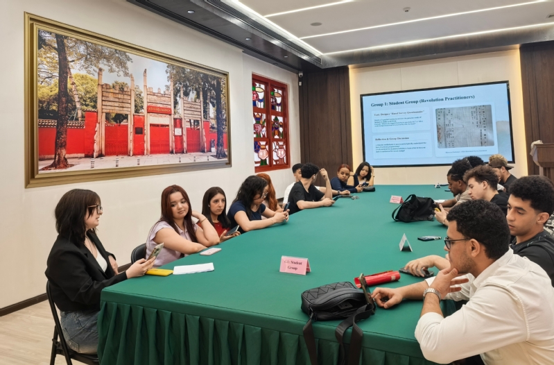 参观结束后,现场开展沉浸式角色扮演互动研讨。学生分为学员组、导师组、农民代表组、国际观察组,立足角色立场分享感悟。学员组追忆革命青年的理想追求,导师组再现理论教学与革命动员场景,农民代表组讲述底层民众的觉醒历程,国际观察组以跨文化视角对比分析中国革命的独特路径与世界影响。各组充分交流、热烈讨论,在思想碰撞中深化对革命价值的理解。活动最后,每位留学生结合参观与研讨撰写简短反思,将所见所感转化为对中国道路的理性认知。