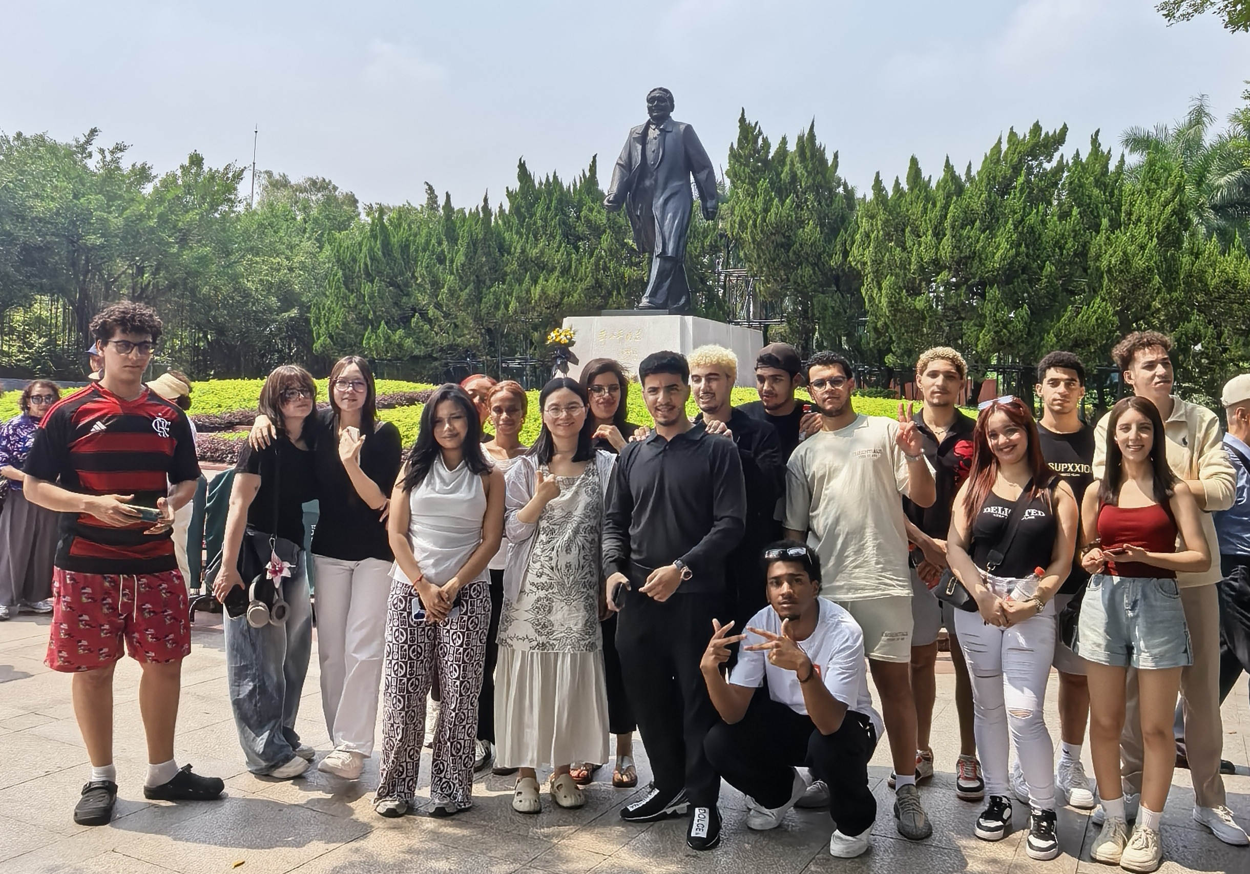 随后,师生一行登上莲花山公园山顶广场,瞻仰邓小平同志铜像,铜像以大步向前的姿态,彰显改革开放总设计师敢闯敢试的坚定决心。留学生驻足铜像前,学习邓小平南方讲话与推动经济特区建设的历史故事;在铜像旁,留学生们参观习近平总书记 2012 年亲手栽种的高山榕,这棵“改革信心树”如今枝繁叶茂,象征着中国坚定不移推进改革开放、接续奋斗的顶层设计与历史传承,让留学生深刻理解中国领导人一以贯之的改革定力与发展智慧。